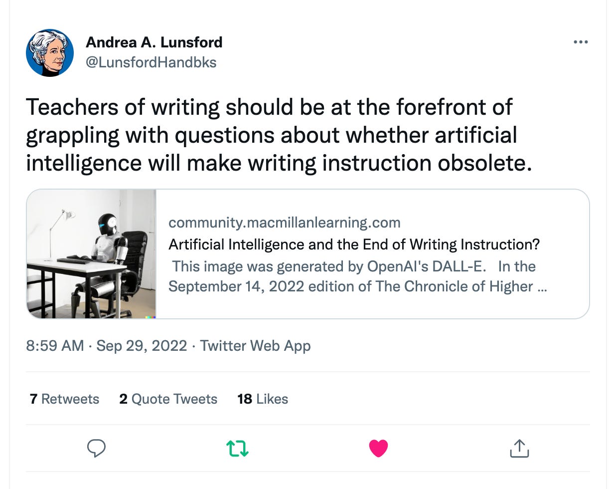 But the shift brought by today's generative AI tools like ChatGPT represents something fundamentally different—a deeper, more radical transformation of writing itself. I saw this coming in October 2022, when I emailed my department about AI tools that could produce near-college-level writing. A month later, ChatGPT launched, and what had been a theoretical concern became an urgent reality. This isn't just another technological innovation in the classroom; it's a fundamental reimagining of what it means to write. As Andrea Lunsford notes, writing instructors must be at the forefront of grappling with these changes.